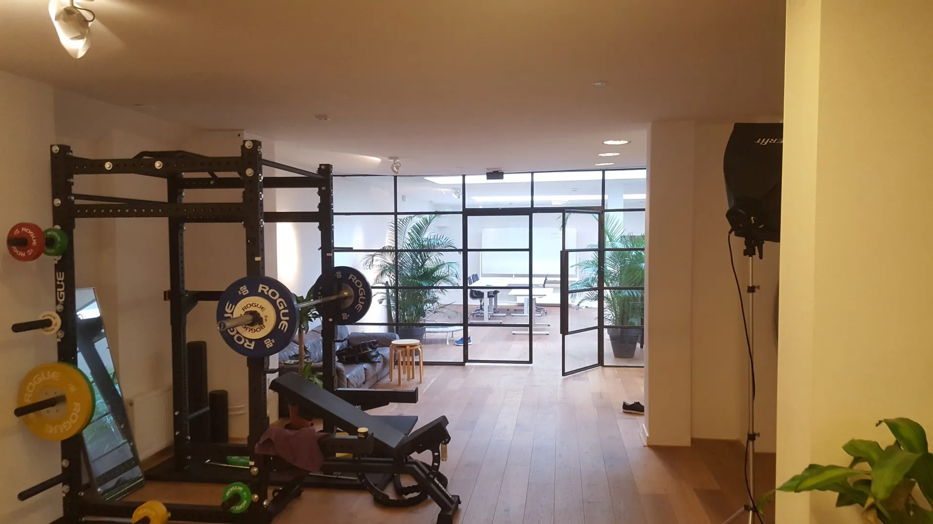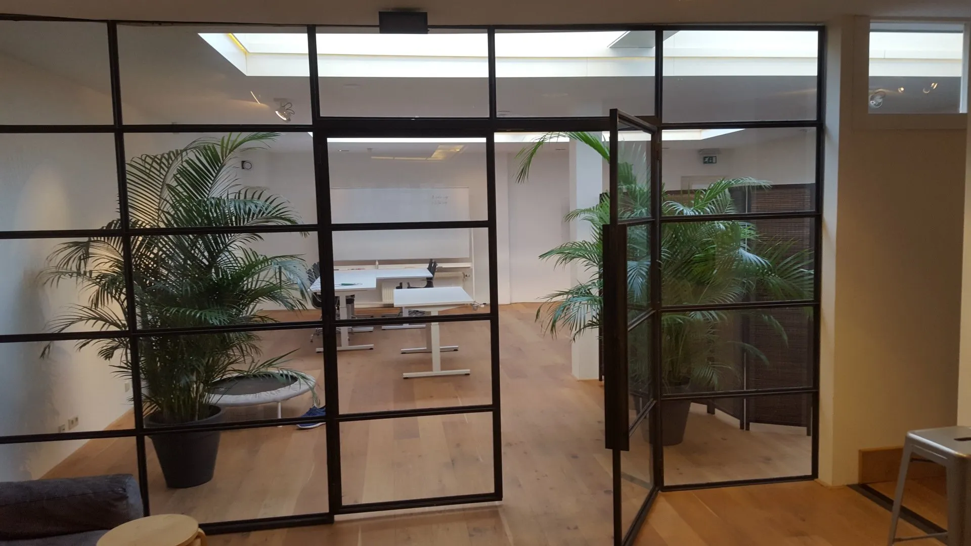 De glazen pui fungeert als een stijlvolle roomdivider tussen het voor- en achtergedeelte van de kantoorruimte, wat zorgt voor een open maar functionele indeling. De achterzijde van het pand profiteert van ruim daglicht dankzij meerdere lichtkoepels, wat bijdraagt aan een prettige en lichte werkomgeving.